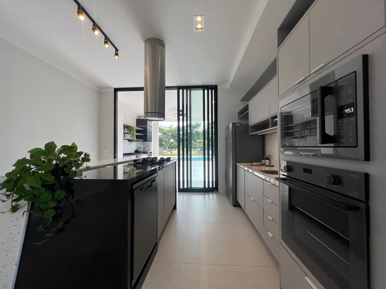 - Cozinha com móveis planejados, lava louças, geladeira, cooktop, forno elétrico e micro-ondas